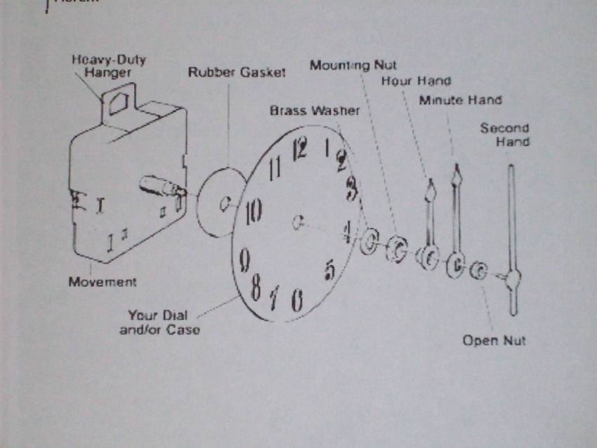4. Install the short "hour hand" pointing up at the 12. Install the longer "minute hand" and small nut. The "minute hand" should also be on the 12. Install the "second hand". Install battery and set clock.